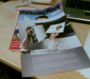 Today’s Marketing Week carries a full page ad for www.printsells.org – a campaign that doesn’t appear to be technically funded by the Royal Mail, but nonetheless is extolling the virtues of Direct Mail – ‘it’s the 1-2-1 media par excellence’ and ‘direct mail is perfect to put your brand in the hands of consumers’.