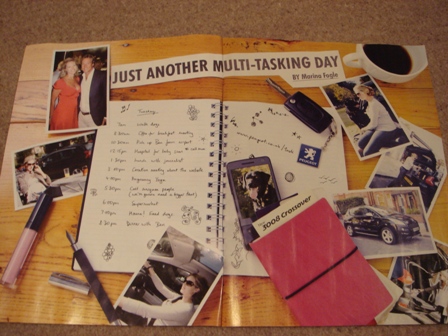 I was struggling to find visuals to make my point, then this week’s Radio Times contained a prime example for the Peugeot 3007, showing Mrs Ben Fogle having ‘Just another multi tasking day’. Seriously, that was the headline: