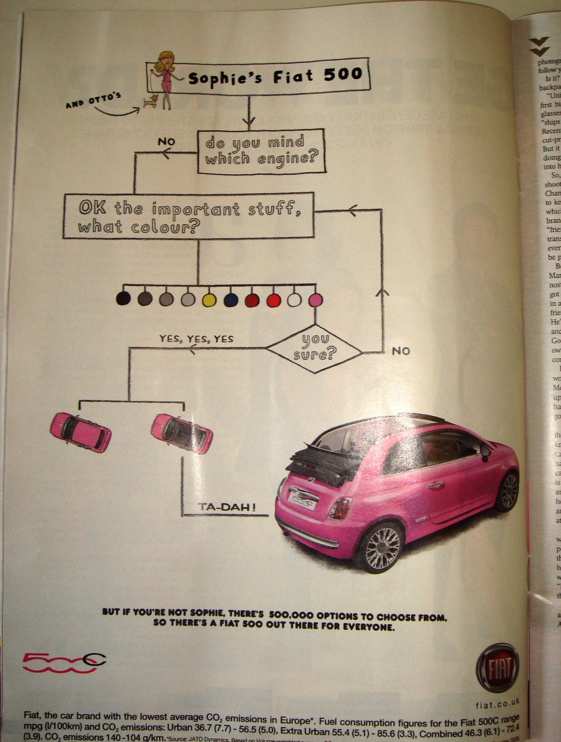 The bottom copy line there’s a Fiat 500 out there for everyone feels like it has been lifted straight from the ‘proposition’ box on the creative brief and the decision tree creative isn’t exactly a new approach. It’s the kind of thing that would come to mind when as a Planner you’re asking yourself ‘could I write an ad from this brief?’ not the finished work you hope will result from it.