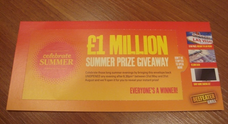 Along with the bill, my smiley waitress delivered this game card, with a ‘come back again before September and you could win a prize’ mechanic – the only rule being that you couldn’t open and reveal whether you’d won until your return visit: