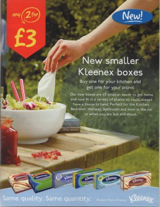 Judging by this ad (in Asda’s customer magazine), Kleenex would like you to use their tissues for all your disposable-wiping-of-stuff needs. When you’ve spilt some chutney at a bbq, you no longer need to reach for a sheet of kitchen towel as a mansize tissue will do the job.