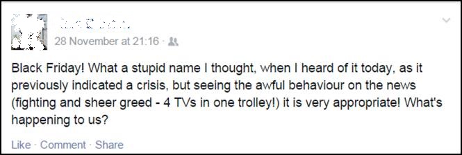 The second thing I didn’t really expect to see was my facebook feed peppered with posts criticising the greed and aggression that came hand-in-hand with Black Friday in some stores, with supermarkets in particular seen as somewhat complicit in encouraging mindless consumption and failing to control the crowds properly.