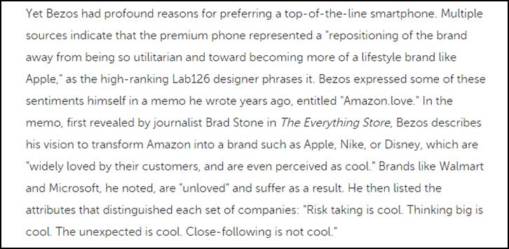 I read this great FastCompany piece about Amazon’s Fire Phone debacle last week (whoever sent me the link, thank you!) and keep coming back to the point the article makes that the smartphone launch failed because Amazon CEO Jeff Bezos was trying to make a cool, premium device to help move Amazon towards being more of a lifestyle brand.